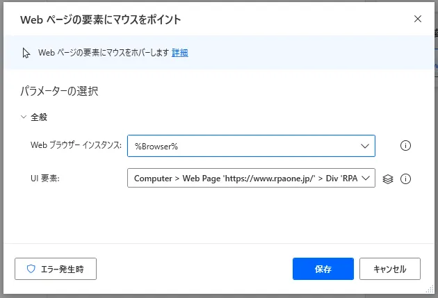 設定画面では2つのパラメータを設定します。最初に対象とするブラウザーインスタンスを選択します。選択するインスタンスがない場合は先にインスタンスを生成する必要があります。次にマウスホバーするUI要素を選択しましょう。単体で使うことは少ないと思いますが、他のアクションと組み合わせながらご利用ください。