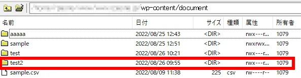 項目冒頭のフローはサーバとの接続後、「ルートディレクトリ」から「wp-content」というディレクトリまで移動し、その直下にフォルダーを作成するというフローですが、実行すると下図のように「document」という名前のフォルダーが「wp-content」フォルダーの下に作成されます。