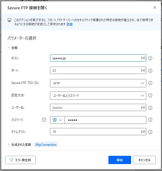 「Secure FTP接続を開く」アクションを利用すると暗号化された状態で、ファイルの送受信を行うことができるようになります。設定画面は「FTP接続を開く」と同じ部分が多く、「ホスト」にはURLのホスト部を入力します。例えば、「https://www.rpaone.jp」であれば「rpaone.jp」がホスト部になります。